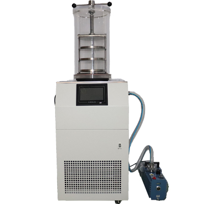 立式凍干機(1臺)、真空泵2XZ-4(1臺)、玻璃罩(1個,含壓蓋裝置)、不銹鋼樣品架(1個)、不銹鋼樣品盤(3個)、真空連接管(1根)、●可選配:(1)進口真空泵(2)油霧過濾器(3)防返油裝置